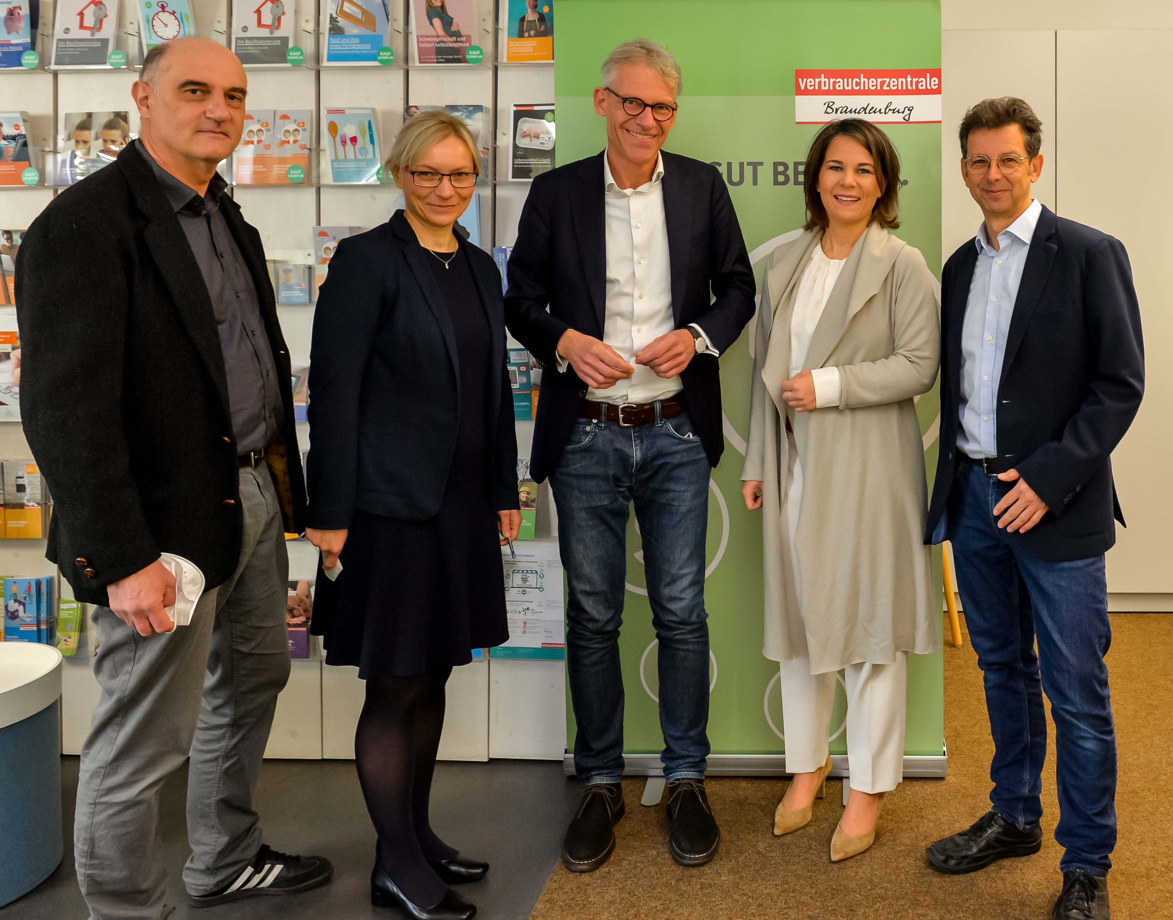 Bildunterschrift: Energieberater Andreas Schmeller, Leiterin Rechtsdurchsetzung Katarzyna Trietz, VZB-Geschäftsführer Christian A. Rumpke, MdB Annalena Baerbock, Rechtsberater Torsten Eick (v.l.n.r.) © Karla Fritze