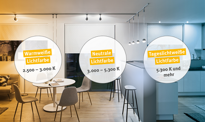 Die Lichtfarbe wird auf der Packung durch die Farbtemperatur in Kelvin (K) dargestellt. Farbtemperaturen von 2.700-3.300 Kelvin werden als "warmweiß" bezeichnet und zeichnen sich durch einen relativ großen Rotlichtanteil aus (gut für eine gemütliche Atmosphäre). Lichtfarben von über 5.300 Kelvin werden als "tageslichtweiß" bezeichnet, sie haben einen höheren Blaulichtanteil und wirken anregend.